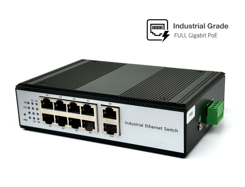 สวิตช์ PoE อุตสาหกรรมแบบ Full Gigabit 10 พอร์ต (8 PoE + 2 Uplink) เป็นอุปกรณ์เครือข่ายที่ออกแบบมาเพื่อส่งข้อมูลและจ่ายไฟผ่านสายเคเบิล Ethernet เดียวไปยังอุปกรณ์ที่รองรับ PoE สวิตช์เหล่านี้มักใช้ในสภาพแวดล้อมที่ท้าทาย เช่น โรงงาน สถานที่ก่อสร้าง หรือพื้นที่กลางแจ้งคุณสมบัติ