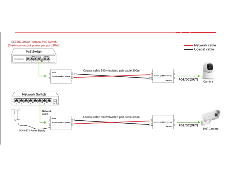 อุปกรณ์สำหรับส่ง สัญญาณเครือข่าย (Ethernet) พร้อม ไฟ PoE ผ่านสาย Coax เดิม เหมาะกับงาน CCTV และการอัปเกรดจากระบบ Analog ไปเป็น IP Camera โดยไม่ต้องเดินสาย LAN ใหม่