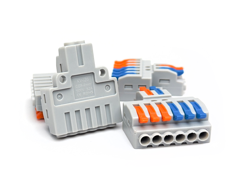 ขั้วต่อสายไฟแบบด่วน (Quick Wire Connector) รุ่น KV426 ซึ่งมักใช้สำหรับงานเดินสายไฟในตู้ควบคุมหรือระบบไฟฟ้าแบบต่าง ๆ โดยไม่ต้องใช้ไขควงในการขันสาย