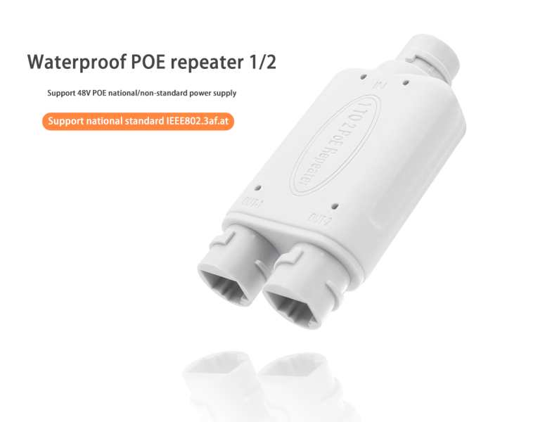 Waterproof PoE Repeater รุ่น 1 ออก 2 ช่วยขยายสัญญาณและจ่ายไฟ PoE ได้สองอุปกรณ์ในเครื่องเดียว รองรับมาตรฐาน IEEE 802.3af/at (PoE/PoE+ 48V) และ Non-Standard PoE ใช้งานง่ายแบบ Plug & Play ไม่ต้องตั้งค่า เหมาะสำหรับ กล้อง IP, Access Point, VoIP Phone และอุปกรณ์ PoE ภายนอกอาคาร